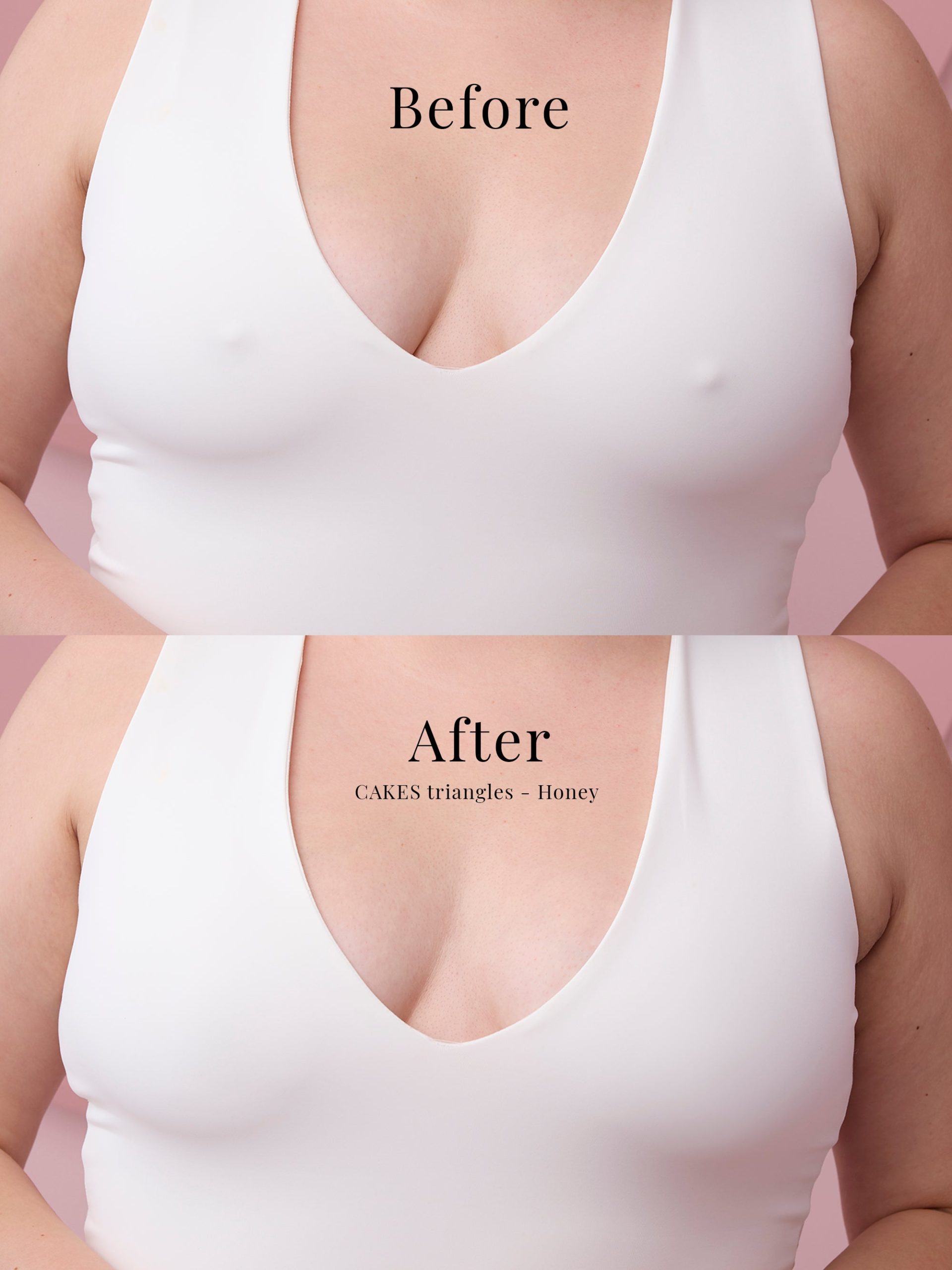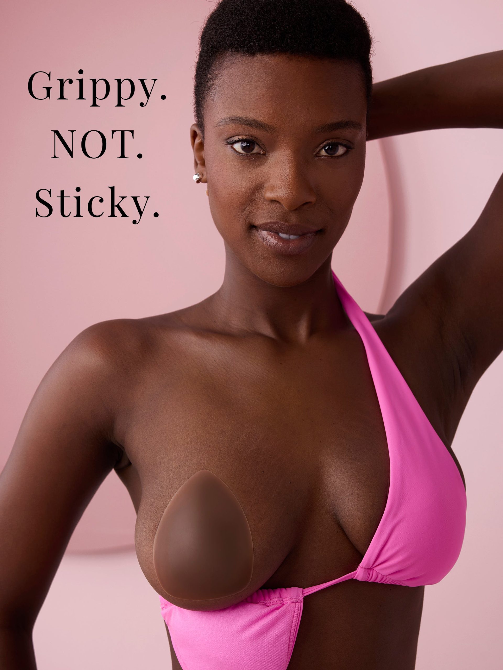 The patent-pending. grippy not sticky™ triangle covers designed for tricky tops. deep vees. workout and swim. Now available in larger sizes!